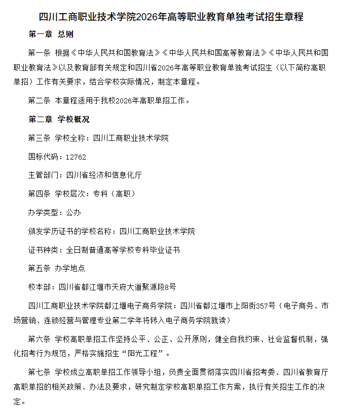 四川工商职业技术学院2026年高职单招招生章程